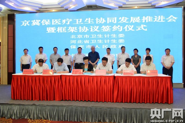 央廣網(wǎng)北京8月25日消息(記者孫冰潔)今日(25日),北京市衛(wèi)生計生委、河北省衛(wèi)生計生委與保定市政府共同簽訂《醫(yī)療衛(wèi)生協(xié)同發(fā)展框架協(xié)議》,北京市5家市屬醫(yī)療機構也分別和保定市5家醫(yī)療機構同時簽訂了醫(yī)療合作協(xié)議,京冀醫(yī)療衛(wèi)生協(xié)同發(fā)展正式起航。