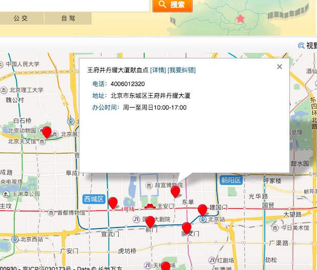 記者登錄北京衛(wèi)計(jì)委官網(wǎng),點(diǎn)擊其中“便民服務(wù)”一欄,在“政務(wù)公開(kāi)惠民便民”地圖中便可找到新上線的“全市獻(xiàn)血點(diǎn)地圖”,獻(xiàn)血點(diǎn)信息除了機(jī)構(gòu)名稱(chēng)和地址外,還公布了采血時(shí)間、服務(wù)功能和咨詢(xún)電話等。