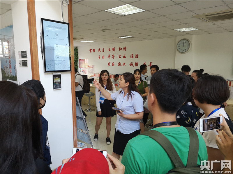 華納社區(qū)黨委書記劉紅霞向記者介紹人臉識(shí)別系統(tǒng),居民可通過“刷臉”參加社區(qū)活動(dòng)簽到、預(yù)約社區(qū)活動(dòng)場地,實(shí)現(xiàn)免證件辦理等業(yè)務(wù)。(央廣網(wǎng)記者 梁爽 攝)