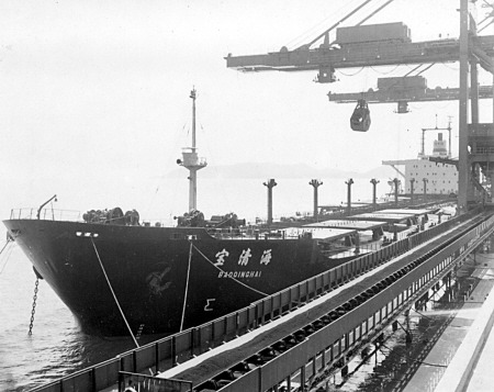 1981年10月5日,“寶清!睆陌拇罄麃喲b載8.263萬噸礦石首次靠泊10萬噸級碼頭。(圖片由寧波舟山港股份有限公司提供)