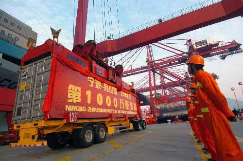 2008年11月21日,寧波舟山港年集裝箱吞吐量首次突破1000萬標(biāo)準(zhǔn)箱。(圖片由寧波舟山港股份有限公司提供)