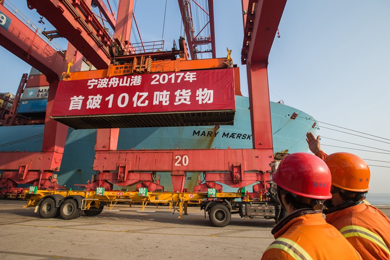 2017年12月27日,寧波舟山港年貨物吞吐量首破“10億”噸,成為全球首個年貨物吞吐量超10億噸的大港。(圖片由寧波舟山港股份有限公司提供)