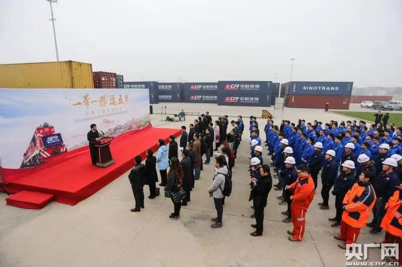 11月14日上午,中國(guó)鐵路西安局集團(tuán)有限公司新筑集裝箱中心站,“‘一帶一路’這五年”中外學(xué)者交流活動(dòng)啟動(dòng)。(央廣網(wǎng)發(fā) 劉翔攝)