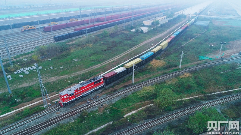 圖為新筑車站正在行駛中的中歐班列。(光明網(wǎng)記者 劉昀昀 季春紅攝)