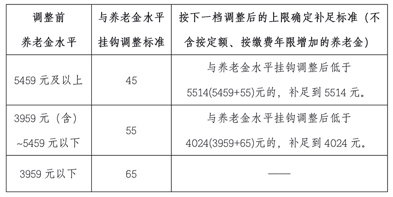 此外,退休人員2018年年底前的月基本養(yǎng)老金由高到低劃分三檔,5459元(含)以上的每人每月增加45元;3959元(含)~5459元之間的每人每月增加55元;3959元以下每人每月增加65元。通過采取低者高調(diào)、高者低調(diào)的方式,保障待遇水平偏低的人員能夠適當(dāng)多增加基本養(yǎng)老金(如下圖所示)。