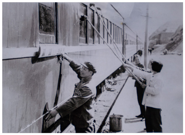 過去列車員手工清洗車身(央廣網(wǎng)發(fā) 銀川客運段供圖)