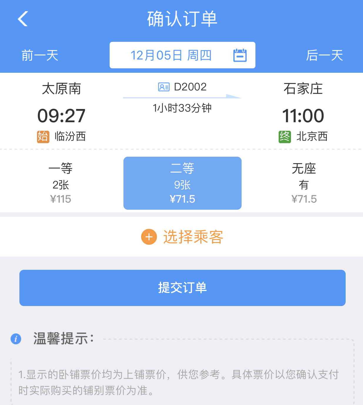 太原南至石家莊的票價(來源:12306網(wǎng)站截圖)