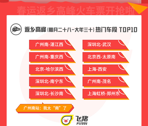 值得注意的是,廣州南站春運高峰客流量最高,成為最繁忙的火車站,占據(jù)了TOP10中的三個車段:廣州南-湛江西,廣州南-重慶西,廣州南-茂名。另外,根據(jù)飛豬平臺火車票預(yù)約情況,春運回程高峰將出現(xiàn)在大年初五至初八,選擇初六返程的人最多。春運回程高峰期間,熱門車段TOP10的到達站同樣被北、上、廣、深四城“包場”,其中廣州南站獨占4席。