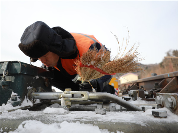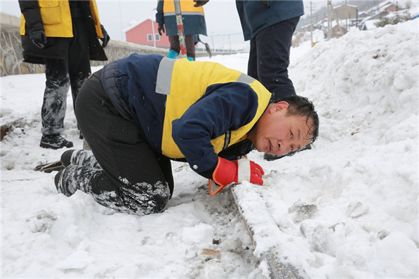 圖為沈陽鐵路通化工務(wù)段松樹鎮(zhèn)線路車間職工正跪在雪地上,檢查凍害處理后線路狀態(tài)(沈陽鐵路供圖)