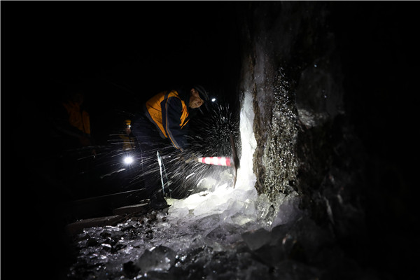 打冰時(shí),隧道內(nèi)陰寒噬骨,他們需一步一抬頭仔細(xì)搜索隧道洞頂?shù)谋,不時(shí)揮動(dòng)4米長的打冰桿把冰柱敲擊下來,他們熟知每一處滲水點(diǎn),還能根據(jù)氣溫變化判斷冰的長勢(shì)。勁兒小了刨不動(dòng),勁兒大了容易被掉落的冰塊和濺起的冰渣碰傷。兩個(gè)多小時(shí)內(nèi),寂靜冰冷的隧道內(nèi)回蕩著他們打冰的敲擊聲。