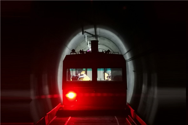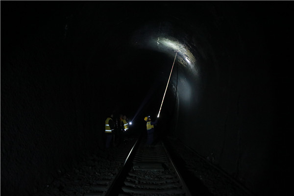 青藏鐵路線德令哈工務(wù)段察汗諾線路車間關(guān)角隧道工區(qū)職工在關(guān)角隧道內(nèi)進(jìn)行檢查,他們經(jīng)常忘了時(shí)間,每天就盼著前面能有點(diǎn)光,就這樣反反復(fù)復(fù)。而在幾十米的地下,白天和黑夜也沒什么區(qū)別,只有看著儀表盤上顯示距離的數(shù)字變化,才知道自己在移動(dòng)。