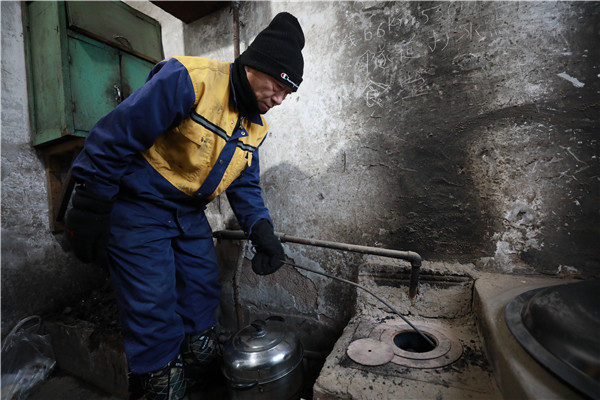 圖為通化工務(wù)段白山橋隧車間職工捅旺爐火取暖(沈陽鐵路供圖)