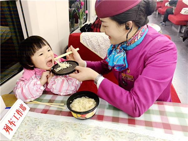 圖為鐘悅正在喂小女孩吃面(成都鐵路供圖)