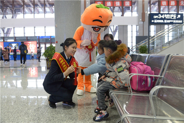 畢節(jié)站火車站列車服務(wù)小分隊(duì)為小旅客送去“!弊趾托履曜8,旅客們開心地笑了,念叨著“福到了、福到了”。