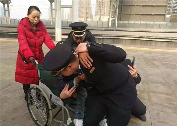 重點(diǎn)旅客的“兒女”。2019年12月13日,K7918次列車緩緩駛?cè)脲a林浩特站臺(tái)。列車停穩(wěn)后旅客們陸續(xù)下車。在旅客乘降完畢后,一位年過七旬的老人,在列車員鐘宏賓的攙扶下向車門口走來。由于是低站臺(tái),列車步梯比站臺(tái)高,鐘宏賓將老人交給車長高圓圓攙扶,自己先下車,站在步梯上將老人抱起,穩(wěn)穩(wěn)地放到了輪椅上。