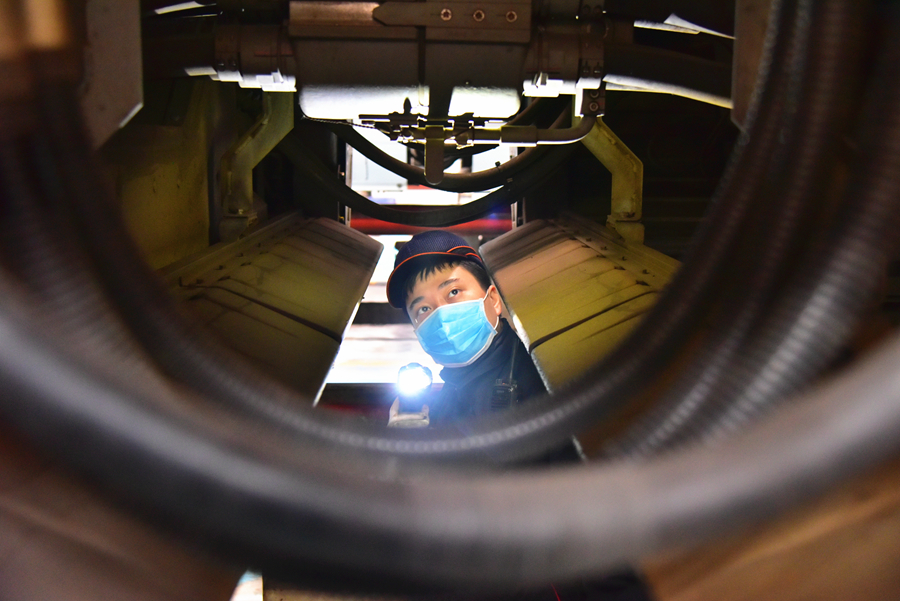 2月24日,一名地勤機(jī)械師正在檢修動(dòng)車組的車鉤連接裝置(央廣網(wǎng)發(fā) 陳亞 攝)