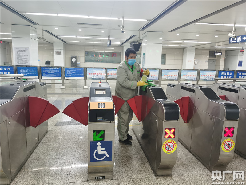 保潔人員正在對(duì)閘機(jī)進(jìn)行消毒(央廣網(wǎng)記者 劉一荻 攝)