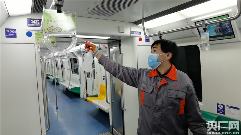 保潔人員正在對(duì)車廂內(nèi)部進(jìn)行消毒(央廣網(wǎng)記者 劉一荻 攝)