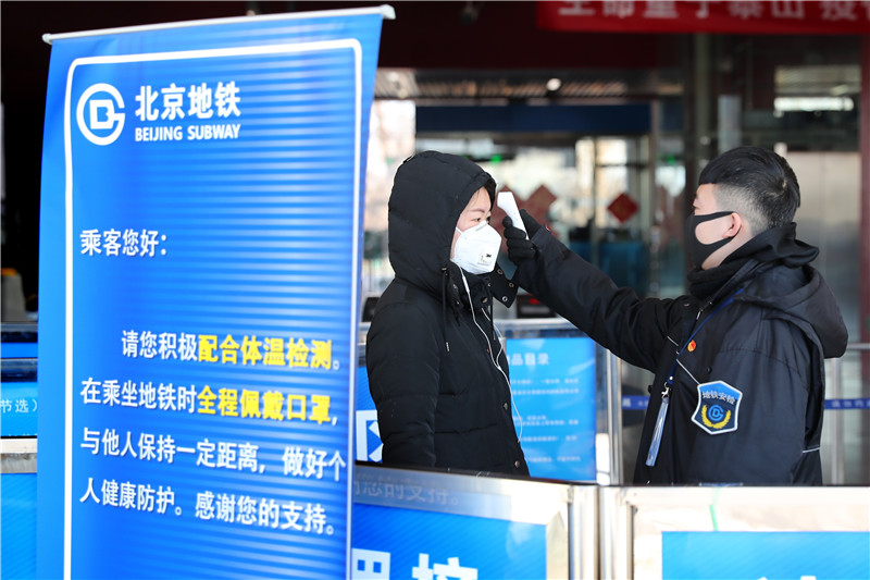 地鐵工作人員正在檢測(cè)乘客體溫(央廣網(wǎng)發(fā) 北京地鐵公司供圖)