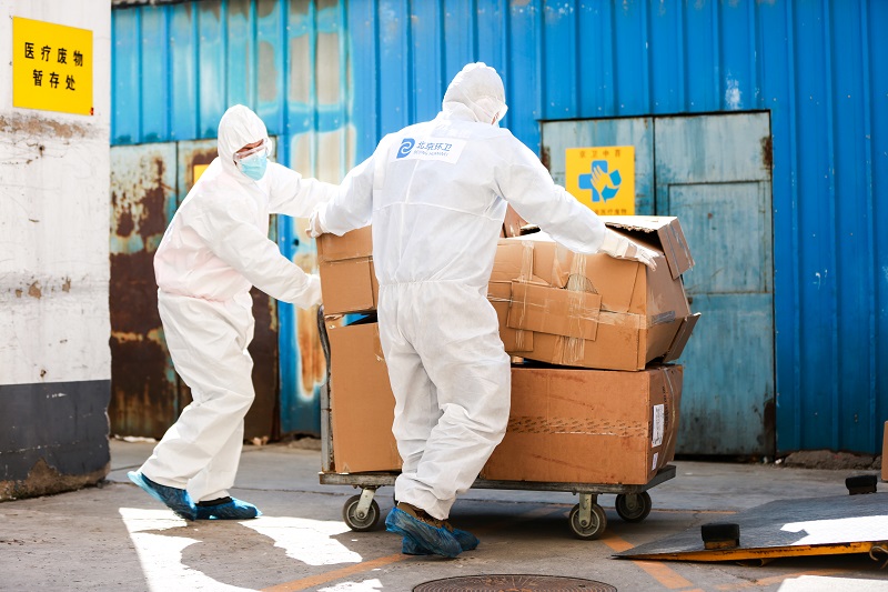 北京環(huán)衛(wèi)集團固廢物流公司醫(yī)廢中心職工在清運醫(yī)療廢棄物(北京環(huán)衛(wèi)集團供圖)