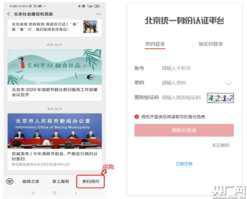 1、在“北京社會建設(shè)和民政”微信公眾號中點擊“祭掃預(yù)約”,進入“北京統(tǒng)一身份認證平臺”。