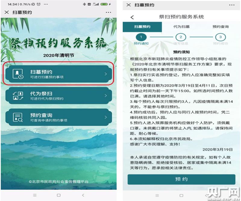 1、預(yù)約祭掃。共有兩種預(yù)約方式,一是關(guān)注“北京社會建設(shè)和民政”微信公眾號進行網(wǎng)上預(yù)約。二是登錄“首都之窗”“北京市民政局”官方網(wǎng)站,查看殯葬服務(wù)機構(gòu)公布的聯(lián)系電話進行預(yù)約。