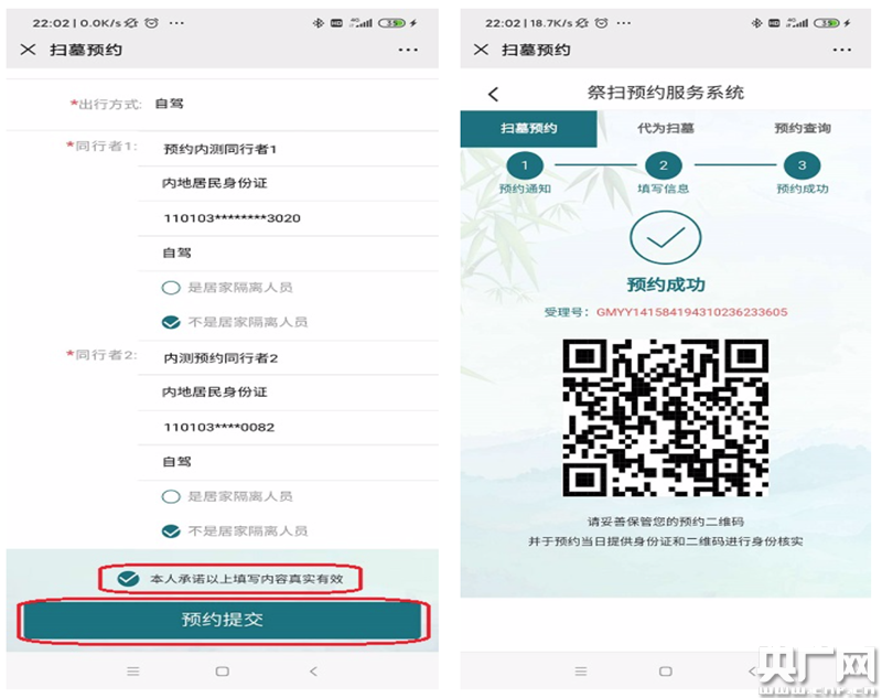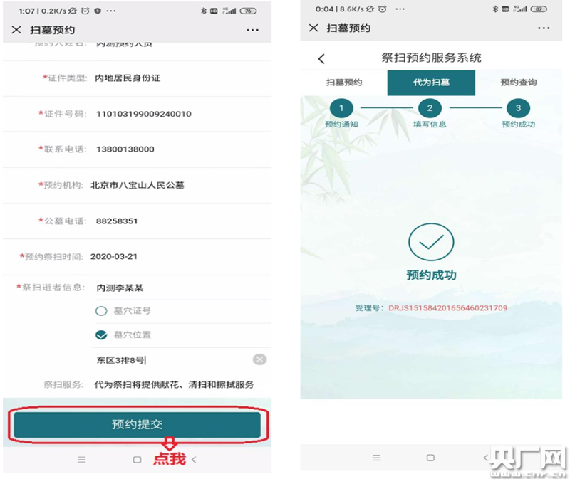 點擊“預(yù)約提交”按鈕完成祭掃預(yù)約,系統(tǒng)將自動生成二維碼(北京市民政局供圖)