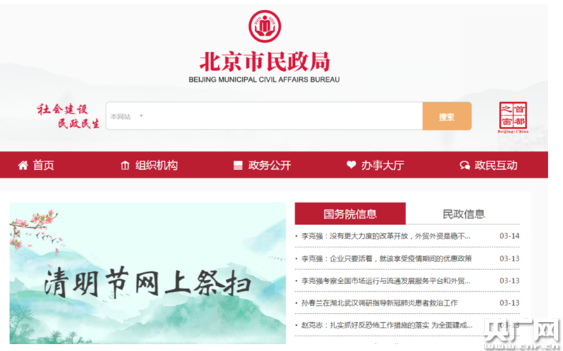 1.登錄首都之窗、北京市民政局或各區(qū)政府官方網(wǎng)站,點擊清明節(jié)網(wǎng)上祭掃專題。