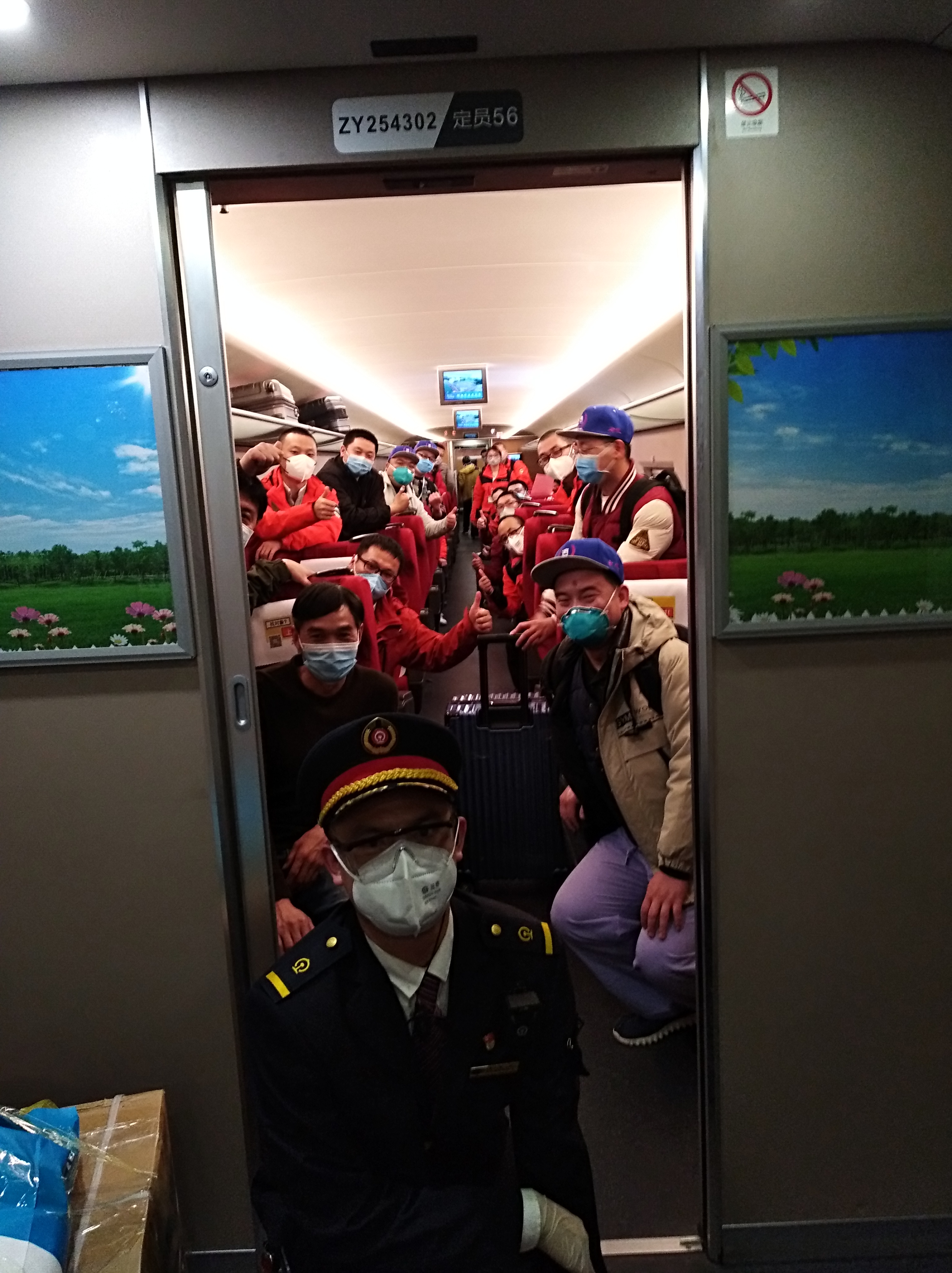 同日,G530次列車(chē)列車(chē)長(zhǎng)彭劉新接到緊急通知,河南省第八批援助湖北醫(yī)療隊(duì)30名隊(duì)員將乘車(chē)自武漢返回鄭州。列車(chē)到達(dá)武漢站,乘務(wù)人員快速引導(dǎo)醫(yī)療隊(duì)在2號(hào)車(chē)廂入座、擺放好行李物品,列車(chē)長(zhǎng)彭劉新向醫(yī)護(hù)人員表達(dá)敬佩與感激之情。列車(chē)到達(dá)鄭州東站前,列車(chē)長(zhǎng)彭劉新再次向戰(zhàn)“疫”英雄們表達(dá)謝意,應(yīng)醫(yī)療隊(duì)成員之邀與30位醫(yī)療隊(duì)成員合影留念。