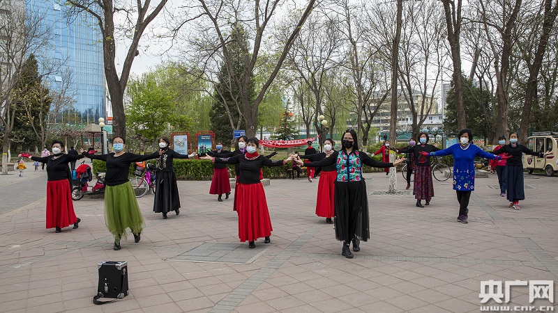 喜愛跳舞的市民運(yùn)動時也戴起了口罩(央廣網(wǎng)記者 張佳琪 攝)