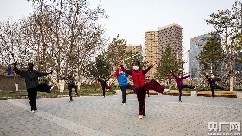 市民在戶外打太極拳,堅持“一米線”安全距離(央廣網(wǎng)記者 張佳琪 攝)