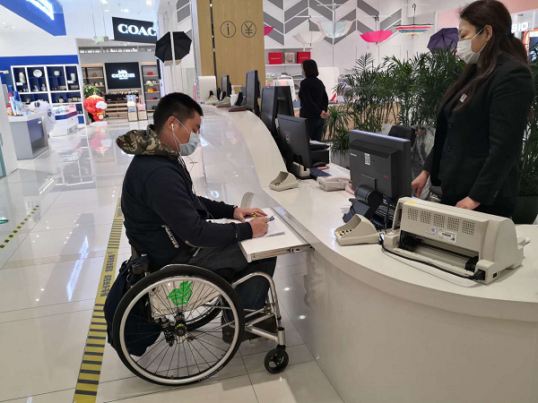 殘疾人朋友體驗北京長安商場的低位柜臺(央廣網(wǎng)發(fā) 北京市殘聯(lián)供圖)