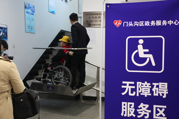 乘坐輪椅的肢體殘疾人體驗政務服務中心無障礙升降設備椅(央廣網(wǎng)發(fā) 北京市殘聯(lián)供圖)