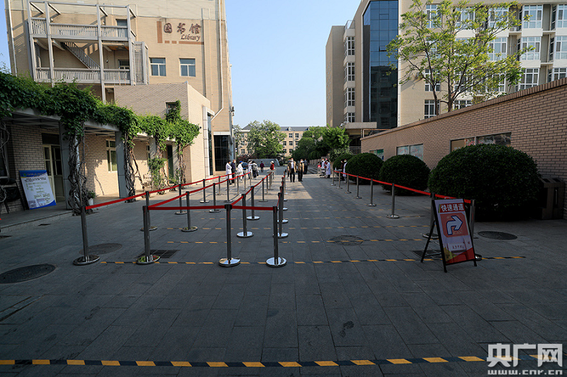 4月27日,北京市房山區(qū)良鄉(xiāng)中學(xué)高三年級學(xué)生陸續(xù)返校。學(xué)校設(shè)置三條入校通道,左右兩側(cè)分別為普通通道、快速通道,普通通道三人一組接受額槍測溫,快速通道通過紅外線測溫,如有測溫超過37.3℃的同學(xué),在進(jìn)行全面消毒后啟用中間的備用通道(央廣網(wǎng)記者 石昊鑫 攝)