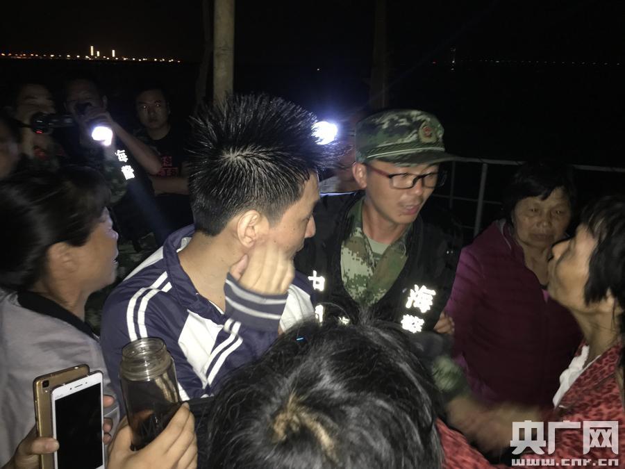 福建海警二支隊今晨成功救起1名落水群眾(央廣網(wǎng)發(fā) 游訓(xùn)利 李晨攝) 救援小組組長張聰下達指令:“根據(jù)潮汐和風(fēng)向判斷,現(xiàn)在是漲潮時間,又是吹攏風(fēng),人應(yīng)該會往港內(nèi)漂,我們?nèi)O網(wǎng)區(qū)仔細尋找!庇纸(jīng)過半個多小時的拉網(wǎng)式搜索,海警官兵在一漁網(wǎng)上發(fā)現(xiàn)該落水村民,光著膀子、手抓浮球,只有頭部露在水面上,臉色發(fā)白、十分虛弱。官兵邊喊話邊拋救生圈給該落水人員,成功將其救起,并為他穿上迷彩服保暖,確認身體狀況良好后,將其安全交給親人。 -
