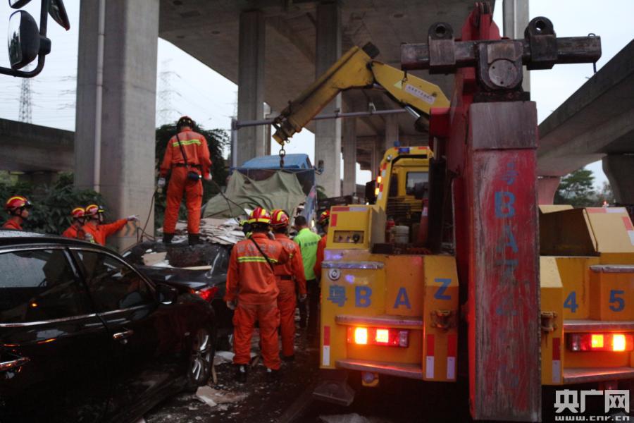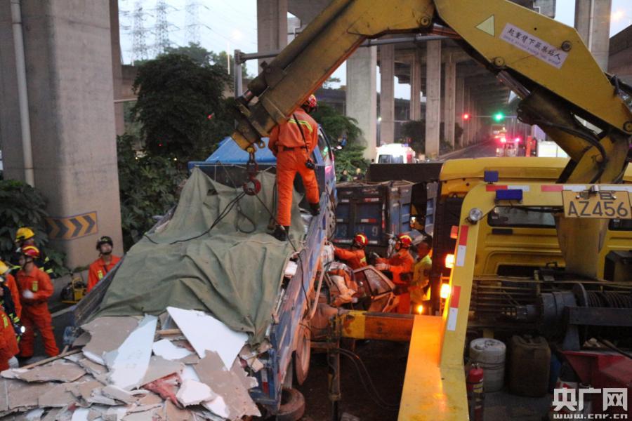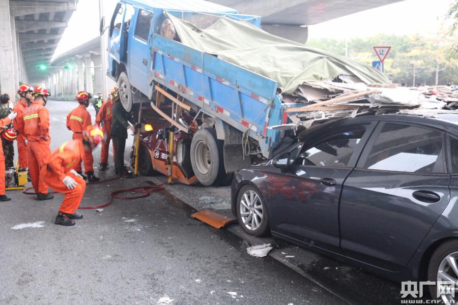 央廣網(wǎng)深圳2月20日消息(記者李強(qiáng) 通訊員黃源 唐麗曼)記者從深圳消防獲悉,2月19日17時(shí)35分,深圳南山區(qū)南海大道與留仙大道交界處往北方向發(fā)生一起七車連環(huán)相撞的嚴(yán)重交通事故,現(xiàn)場有人員被困。西麗消防中隊(duì)接警后立即出動(dòng)3輛消防車15名指戰(zhàn)員火速趕赴現(xiàn)場處置。 據(jù)了解,事故為兩輛貨車、一輛駕校教練車、一輛混凝土攪拌車、兩輛小轎車和一輛SUV車七車連撞。其中教練車被夾在兩輛貨車中間,被后車埋壓,整車已嚴(yán)重變形,車內(nèi)有一女子被困,并有多車漏油。消防員立即展開救援行動(dòng),用水槍對(duì)漏油的車輛進(jìn)行稀釋冷卻,同時(shí)利用支撐頂桿撐起埋壓小車的大車,配合120救援人員對(duì)被困人員進(jìn)行輸液,為避免傷者收到二次傷害,中隊(duì)指揮員協(xié)調(diào)交警出動(dòng)大吊車對(duì)壓頂?shù)牡踯囘M(jìn)行起吊,在壓住小車的大車被調(diào)開之后,消防員利用液壓擴(kuò)張器將嚴(yán)重變形的小車進(jìn)行破拆,成功將被困人員救出。在場的醫(yī)務(wù)人員立即將其送往醫(yī)院救治。 -