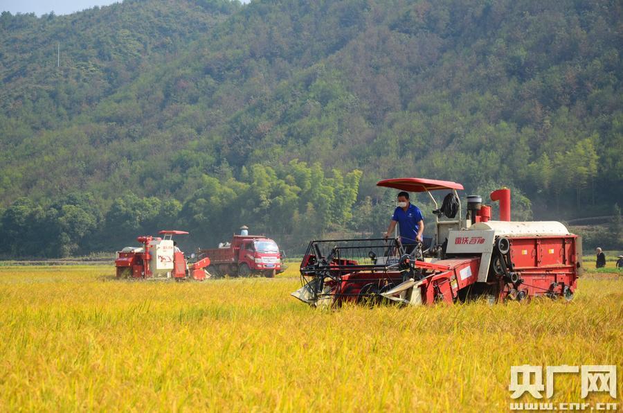 在湖南省懷化市溆浦縣水東鎮(zhèn)千畝再生稻高產(chǎn)示范片,收割機正忙著收割再生稻。(央廣網(wǎng)發(fā) 曾偉攝) 據(jù)了解,今年湖南省農(nóng)技推廣總站在懷化溆浦創(chuàng)辦示范片,種植面積達1069畝,選擇“Y兩優(yōu)9918”“甬優(yōu)4149”等優(yōu)勢品種,全程機械化生產(chǎn),每畝可增收1000元。