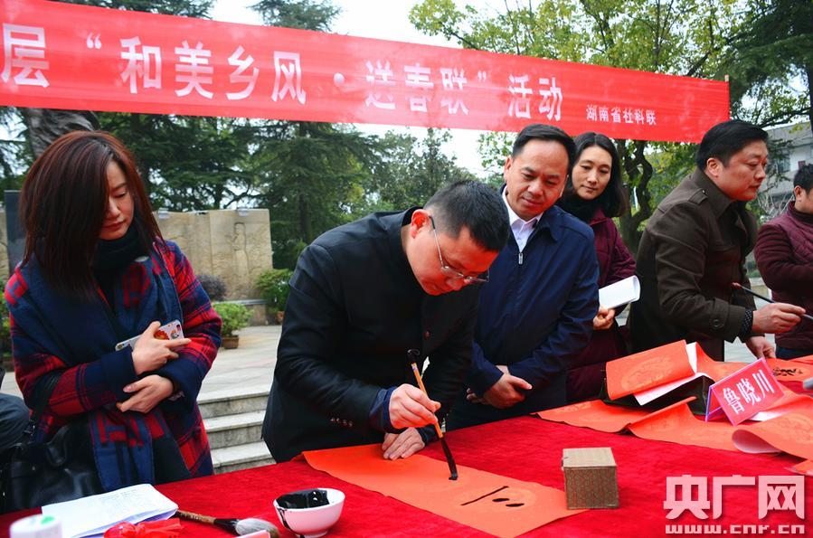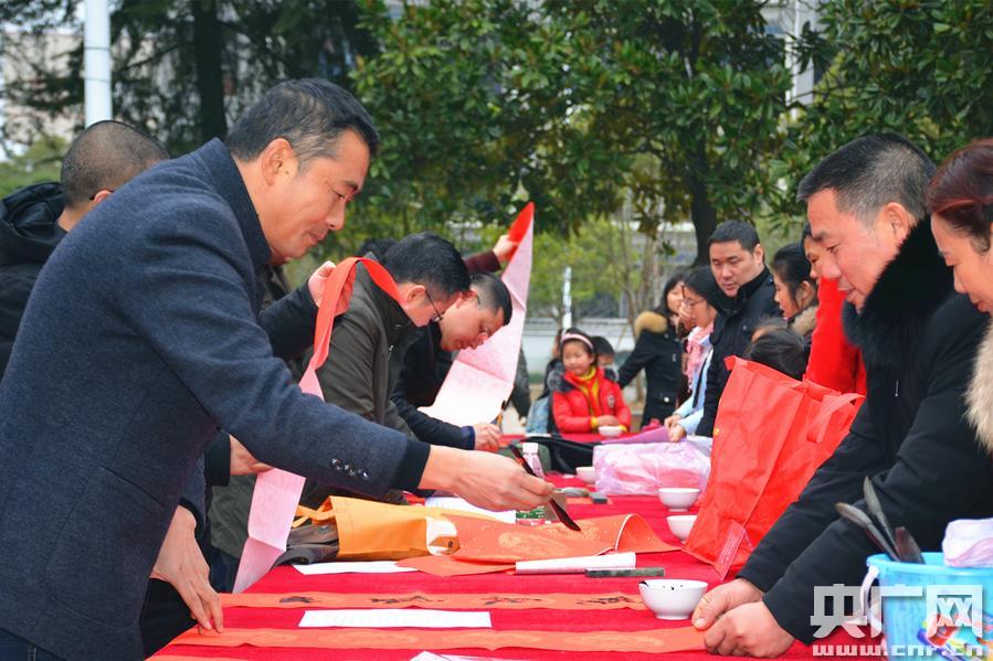 湖南省社科聯(lián)的書法家們現(xiàn)場潑墨,為群眾免費贈送春聯(lián)(央廣網(wǎng)發(fā) 劉法蘭攝) 央廣網(wǎng)懷化1月22日消息(記者堯遙 通訊員劉法蘭)雖說距離春節(jié)還有二十多天,可是年味已經(jīng)“冒”出了頭。近日,來自湖南省社科聯(lián)的書法家們在懷化市溆浦縣警予廣場現(xiàn)場揮毫潑墨,為群眾免費贈送上春聯(lián)和祝福。 此次書寫的春聯(lián)內(nèi)容,都是書法家首創(chuàng),每一副春聯(lián)就是一副書法作品,別具新意。“我們家是做生意的,希望來年生意興隆!”來自溆浦民主街的舒阿姨請中國楹聯(lián)學(xué)會理事、湖南省楹聯(lián)家學(xué)會副主席魯曉川幫她寫一副春聯(lián)。 湖南省社科聯(lián)軟科學(xué)研究室、省社科普及助理研究員龍艷說,現(xiàn)在大家都習(xí)慣了上街購買春聯(lián),忽視了寫春聯(lián)的意義和樂趣!拔覀儼褍(yōu)秀文化送到群眾身邊,也送上最美好的祝愿。通過進基層送春聯(lián)的方式,讓群眾現(xiàn)場體會到書法的魅力,感受名家風(fēng)采,喚醒群眾對傳統(tǒng)文化的記憶。” 據(jù)介紹,今年的送春聯(lián)活動溆浦是第一站,接下來他們還將去到省級貧困村威虎山村,把春聯(lián)送到最基層。此外,湖南省社科聯(lián)每年都會舉行一系列的社科普及進基層活動,在特定的時間節(jié)點,開展不同的文化活動,加強傳統(tǒng)文化的宣傳,提升文化自信。