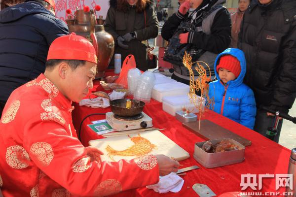 各類傳統(tǒng)小吃香氣四溢,現(xiàn)場制作的糖人、面人、棉花糖、熟梨糕、糖堆兒、大銅壺等吸引著居民駐足觀看、流連忘返。