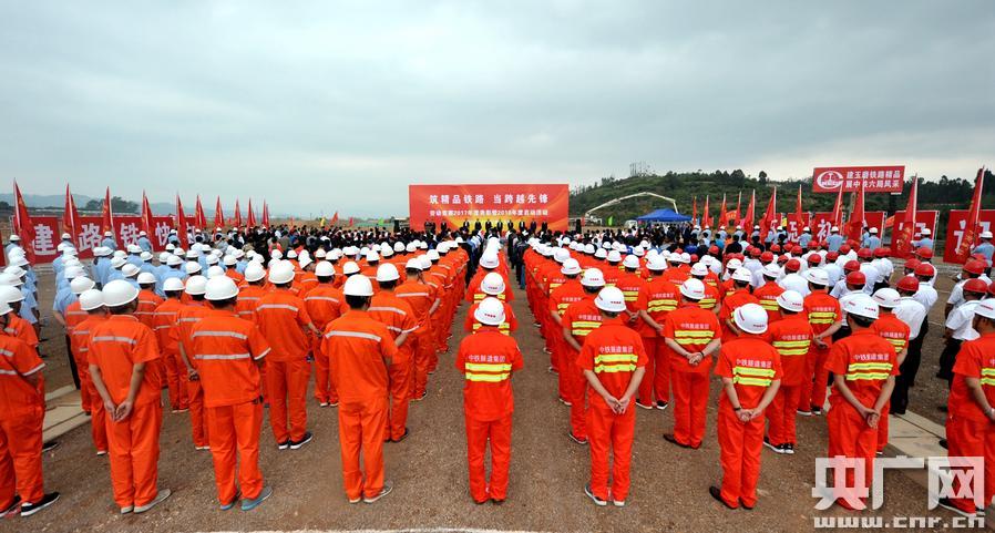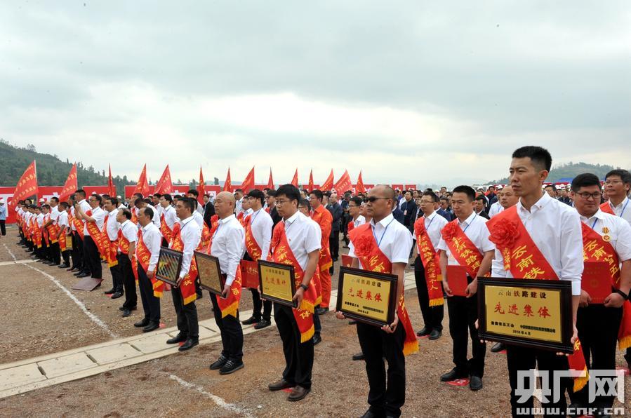 云南省“筑精品鐵路 當(dāng)跨越先鋒”勞動競賽啟動儀式現(xiàn)場。(央廣網(wǎng)發(fā) 張偉明攝) 央廣網(wǎng)昆明4月28日消息(記者李健飛 通訊員張偉明)記者今日(4月28日)從中國鐵路昆明局集團(tuán)有限公司滇南鐵路建設(shè)指揮部獲悉,位于云南省玉溪市的在建中老國際通道玉磨鐵路研和站路基場坪土石方填筑基本完成,路基附屬工程全面展開,車站有望在年內(nèi)正式投入使用,這將是中老鐵路首個投入使用的大型貨運(yùn)站。 云南省人民政府、云南省總工會和中國鐵路昆明局集團(tuán)有限公司及40多家鐵路建設(shè)施工單位于4月27日在研和站舉行云南省“筑精品鐵路 當(dāng)跨越先鋒”勞動競賽2017年度表彰暨2018年度啟動活動,通過勞動競賽的方式,大力弘揚(yáng)勞模精神和工匠精神,動員參建各方爭創(chuàng)一流,比學(xué)趕超,奮勇爭先,加快云南“八出省五出境”鐵路網(wǎng)建設(shè),持續(xù)掀起鐵路建設(shè)高潮,加快把與周邊國家互聯(lián)互通的“接口”做好,更好地服務(wù)云南跨越式發(fā)展和“一帶一路”建設(shè)。 據(jù)統(tǒng)計,2017年云南鐵路建設(shè)完成投資 207.3億元,昆明東站三級六場、昆明南站至昆明站客車聯(lián)絡(luò)線投產(chǎn)運(yùn)營,服務(wù)“一帶一路”的大(理)臨(滄)、玉(溪)磨(憨)、大(理)瑞(麗)等鐵路轉(zhuǎn)入施工高峰,廣(通)大(理)、永(仁)廣(通)鐵路進(jìn)入攻堅(jiān)期。27日上午,云南省政府和云南省總工會在競賽活動啟動儀式上,對2017年參與云南鐵路建設(shè)業(yè)績突出的集體或個人進(jìn)行了表彰,分別授予他們云南省五一勞動獎狀、云南省工人先鋒號、云南省鐵路建設(shè)先進(jìn)集體、云南省五一勞動獎?wù)潞驮颇翔F路建設(shè)先進(jìn)個人等榮譽(yù)稱號,并號召鐵路建設(shè)各部門、各單位合力攻堅(jiān)、群策群力,高質(zhì)量推進(jìn)云南在建鐵路項(xiàng)目,為云南建成面向南亞東南亞輻射中心提供強(qiáng)有力的交通基礎(chǔ)設(shè)施保障。 帶著喜悅的心情,受表彰的先進(jìn)集體和個人觀摩了由中鐵六局承建的研和站,饒有興趣地了解車站建設(shè)情況,積極為云南鐵路建設(shè)出良謀獻(xiàn)良策。 中鐵六局路橋公司玉磨鐵路項(xiàng)目分部經(jīng)理毛朝勛介紹,研和站分別連接中越國際通道昆玉河鐵路和中老國際通道玉磨鐵路,是中越中老國際鐵路通道的重要貨運(yùn)樞紐。于2016年5月開工,計劃2018年年底投入運(yùn)營,目前研和車站路基場坪土石方挖填完成共計1000余萬方,已經(jīng)基本填筑完成,車站主體工程將于6月底完工。 研和站占地近2000畝,設(shè)列車到達(dá)和始發(fā)線正線8條,預(yù)留5條,配有集裝箱、散堆裝貨物、商品汽車和笨大貫通式、怕濕貨物線路及貨場。車站設(shè)計年貨運(yùn)量近期到發(fā)180萬噸,遠(yuǎn)期到發(fā)270萬噸。 中國鐵路昆明局集團(tuán)有限公司相關(guān)負(fù)責(zé)人介紹,今年云南鐵路統(tǒng)籌建設(shè)資源、管理技術(shù)形成攻堅(jiān)合力,全年鐵路建設(shè)投資計劃安排250億元。今年一季度,云南省完成鐵路建設(shè)投資 51.02億元,占全年計劃投資的20.4%。 黨的十八大以來,云南鐵路完成投資1253億元,投資規(guī)模是上一個5年的2.2倍。在近期國家批復(fù)的《中長期鐵路網(wǎng)規(guī)劃》中,云南省列入中長期規(guī)劃的項(xiàng)目有重慶至昆明高鐵、南昆鐵路擴(kuò)能改造、攀枝花至大理、蒙自至文山鐵路等18個項(xiàng)目,建設(shè)規(guī)模3485公里,總投資2965億元,規(guī)劃建設(shè)規(guī)模按省份劃分位列全國第二。
