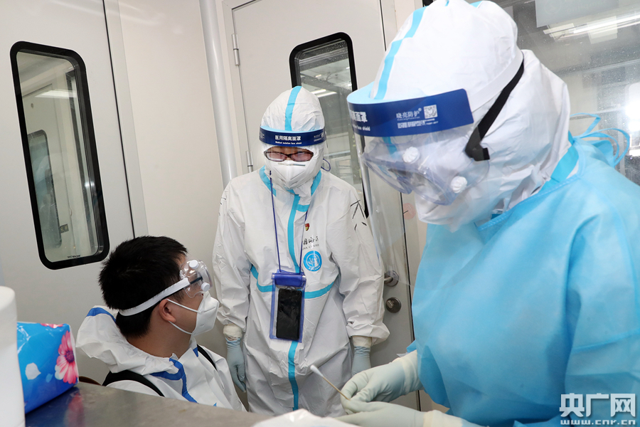 圖為楊杰在口岸一體化生物安全方艙內(nèi)查看入境旅客鼻咽拭子樣本采集工作情況(央廣網(wǎng)發(fā) 池兆恩 攝)