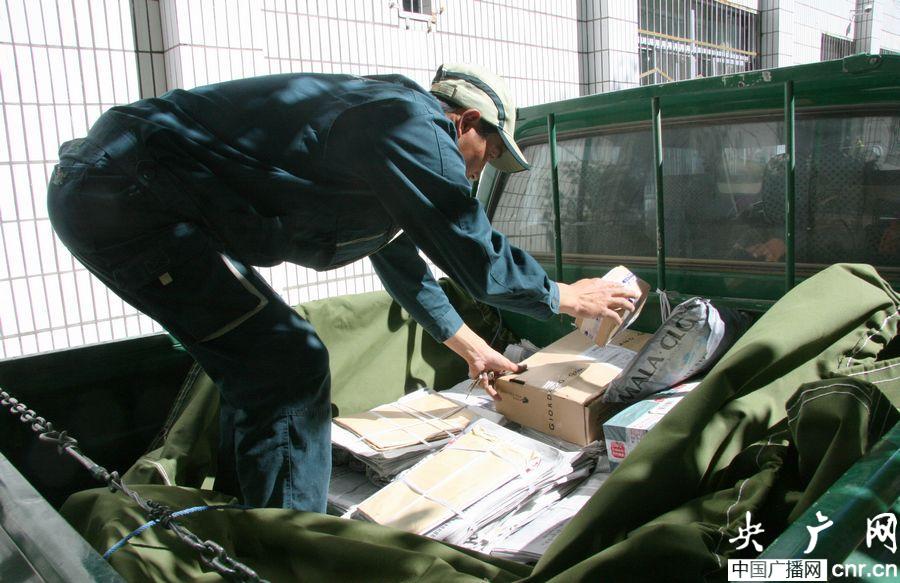 格桑正在認(rèn)真清點(diǎn)今天要派送的郵件和報(bào)紙(央廣網(wǎng)記者 普布次仁 攝)