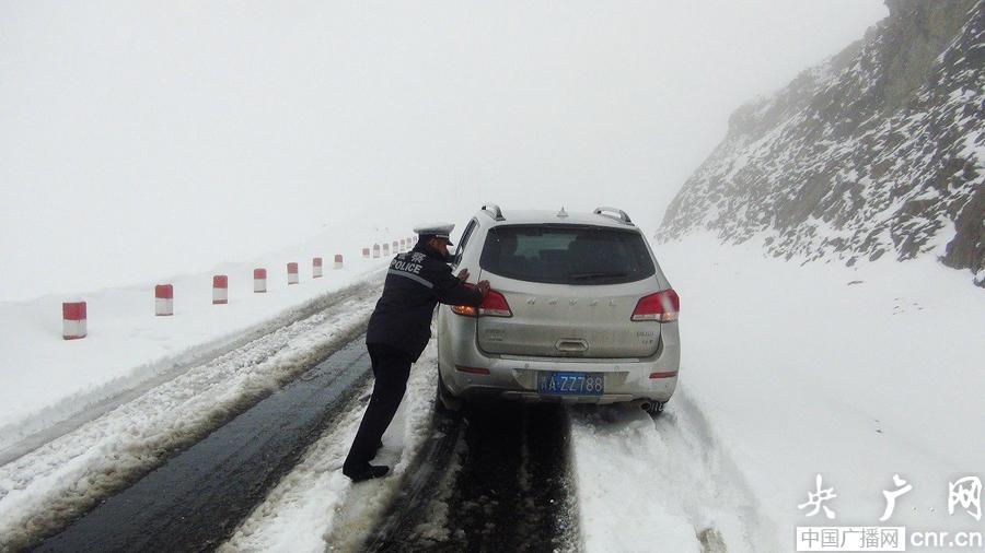 海北州祁連縣公安局交警大隊民警攜帶鐵鍬等工具迅速趕往冰溝達坂山頂。短短幾個小時,冰溝達坂山頂?shù)姆e雪已有一米多深,能度不足十米。民警們到達現(xiàn)場后一面搜救被困群眾一面分流車輛疏導交通。民警們和被困駕駛員一起,在風雪中清雪撒沙、推車、裝防滑鏈,直到傍晚時分,所有被困車輛全部通過冰溝達坂。