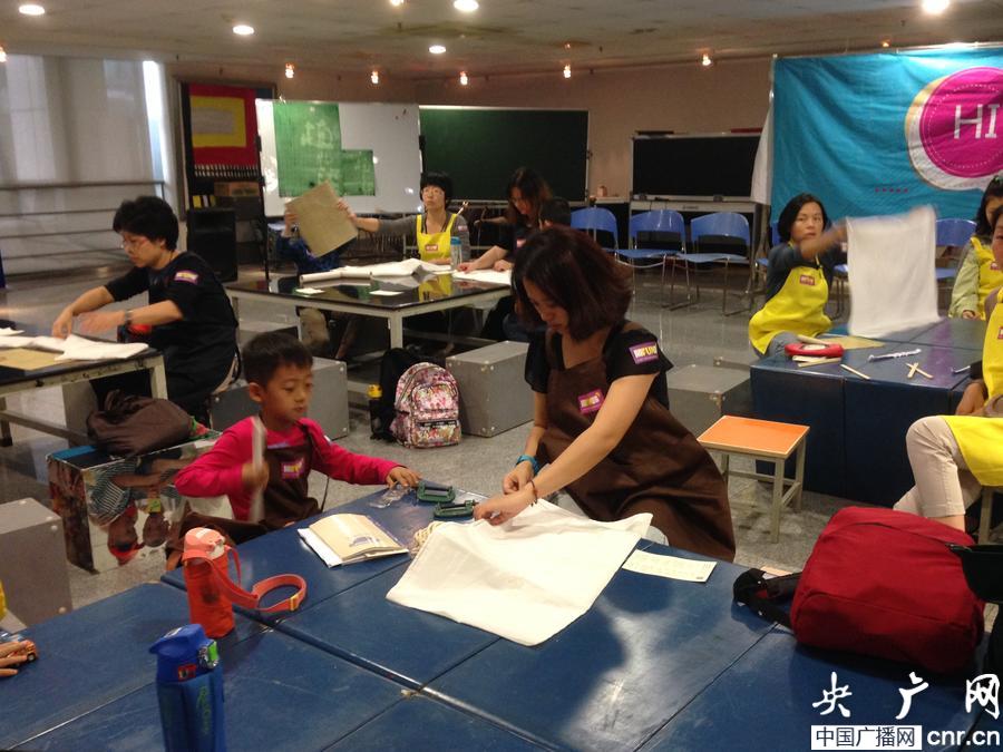 家長(zhǎng)和小朋友們?cè)诶蠋煹闹笇?dǎo)下挑選服裝面料進(jìn)行浸染。央廣網(wǎng)發(fā) 陳菲攝