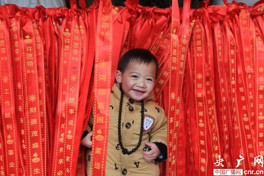 3月5日,在柳城縣鳳山鎮(zhèn)開(kāi)山寺,一名小男孩在一大串許愿帶中玩耍