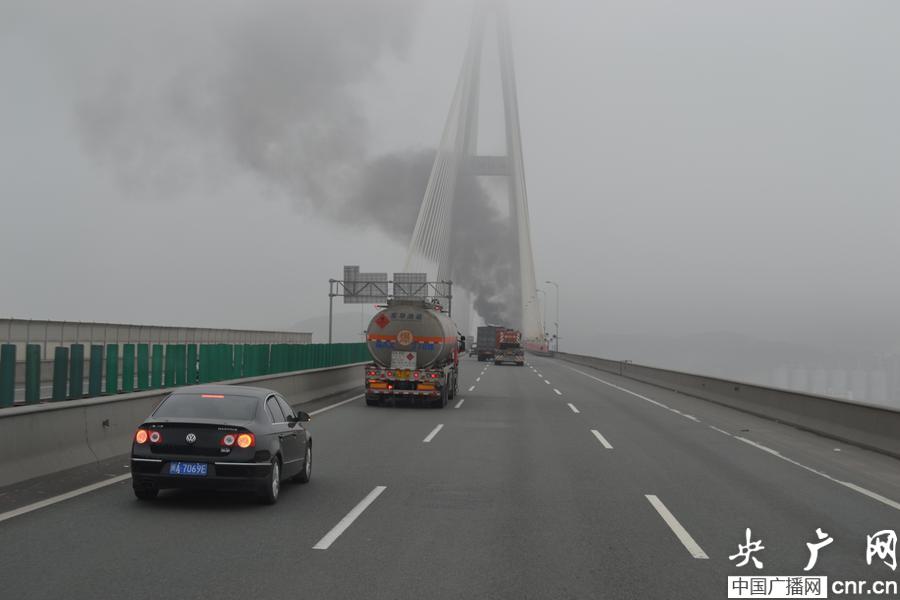 福州:一輛貨車(chē)行駛在青洲大橋途中起火(央廣網(wǎng)發(fā) 黃綠榮 攝)