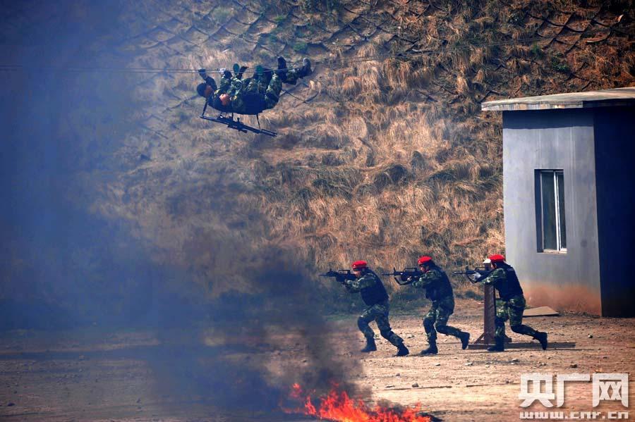 央廣網(wǎng)烏魯木齊4月29日消息(記者張雷 羅成 通訊員陳莉)“某繁華路段,正在執(zhí)勤的公安邊防官兵徒步巡邏中。突然遭遇一輛面包車沖撞碾壓,并投擲爆炸裝置。隨后,官兵迅速散開閃避。面對4名暴恐分子手持刀斧從車輛上沖殺出來,公安邊防官兵果斷冷靜向暴恐分子開槍,三名暴恐分子被擊斃,一名暴恐分子被警犬撲咬……”這是昨天下午,記者在新疆公安邊防總隊訓練基地舉行的四項建設暨大練兵“精專業(yè)”觀摩會上看到的一幕。