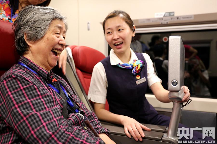 列車長(zhǎng)張子玉為85歲高齡的趙彩霞介紹電視功能,老人高興得開懷大笑心。(央廣網(wǎng)發(fā) 雍萬俊攝)