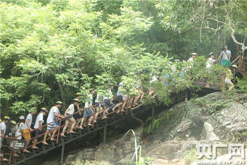 在景區(qū)夢(mèng)幻谷,可以看到不少排著隊(duì)伍參加踏瀑戲水的游客,他們?cè)谠鷳B(tài)的雨林叢林中挑戰(zhàn)不同難度的戲水關(guān)卡,無論是大人還是孩子,都裝備齊全興致盎然地比拼闖關(guān),不時(shí)聽見嬉戲打鬧的歡笑聲。