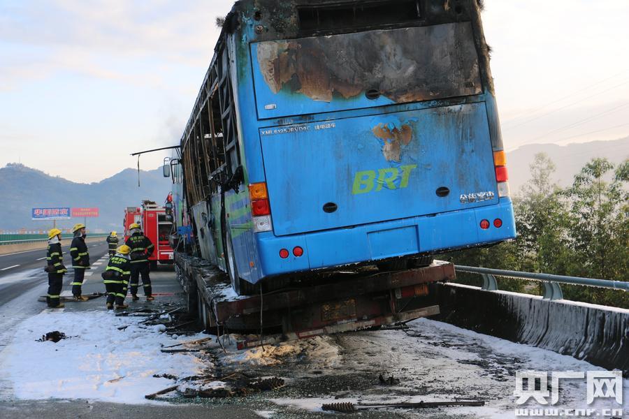 接警后,福州市消防指揮中心立即調(diào)集連江縣消防大隊鳳城中隊的兩部消防車和10名消防官兵,會同高速交警和路政部門趕到現(xiàn)場進(jìn)行處置。到場時,兩輛車身標(biāo)有BRT字樣的公交車不同程度過火,其中一輛幾乎被大火吞噬,另一輛也已經(jīng)被引燃。截止當(dāng)日清晨7時30分許,明火被徹底撲滅。